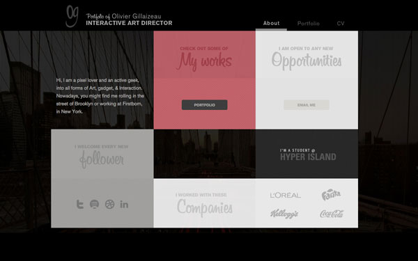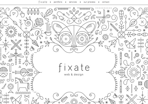 整個(gè)首頁采用黑色線條矢量圖組成一個(gè)密集式的豐富多彩的圖片,突出設(shè)計(jì)原創(chuàng)性。而字體也與此相稱,整個(gè)網(wǎng)站設(shè)計(jì)感很強(qiáng),還適當(dāng)裝飾了動畫效果,不失為上乘之作。