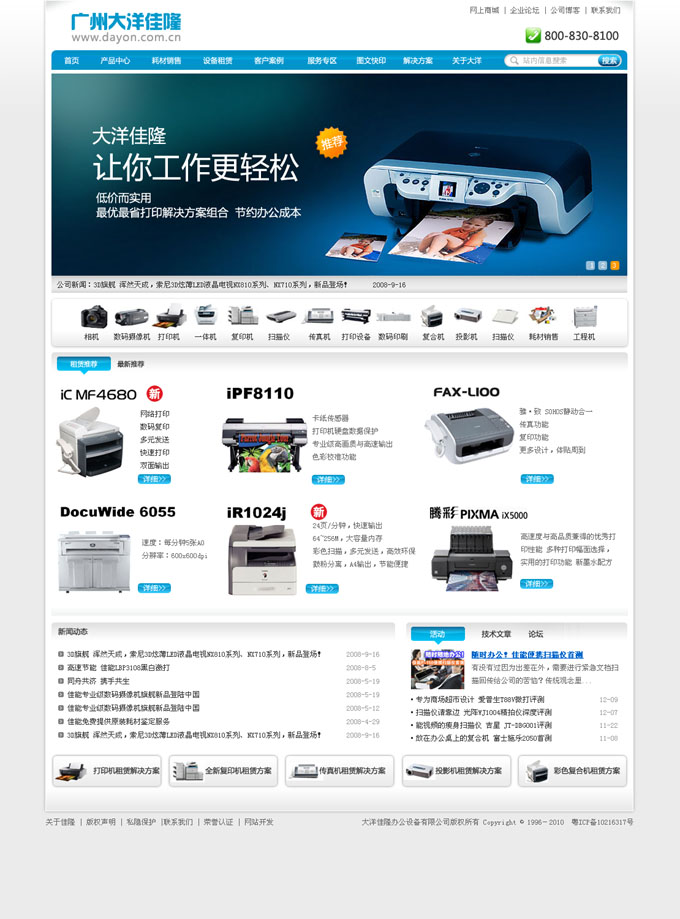 ???? 廣州大洋佳隆辦公設備有限公司是一家辦公設備銷售、維修、租賃的專業(yè)機構,是日本佳能公司在華南地區(qū)最大的綜合型佳能經銷商,是佳能公司認定的佳能廣州地區(qū)分銷商、佳能五星級維修站、佳能中國最大零配件中心、佳能復印機租賃中心。公司現(xiàn)有員工150余人,其中工程技術人員75人,36人取得佳能星級技術認證,其中2位工程師獲佳能全球最高技術認證:佳能五星級技術證書。具有彩色復印機、大型數(shù)碼復印機、工程復印機、工程曬圖機、繪圖儀等超大型辦公設備的銷售、維修及技術支持能力。同時大洋佳隆也是理光復印機、傳真機,施樂復印機、工程復印機、傳真機,理想一體油印機,KIP工程復印機等品牌的指定經銷商。