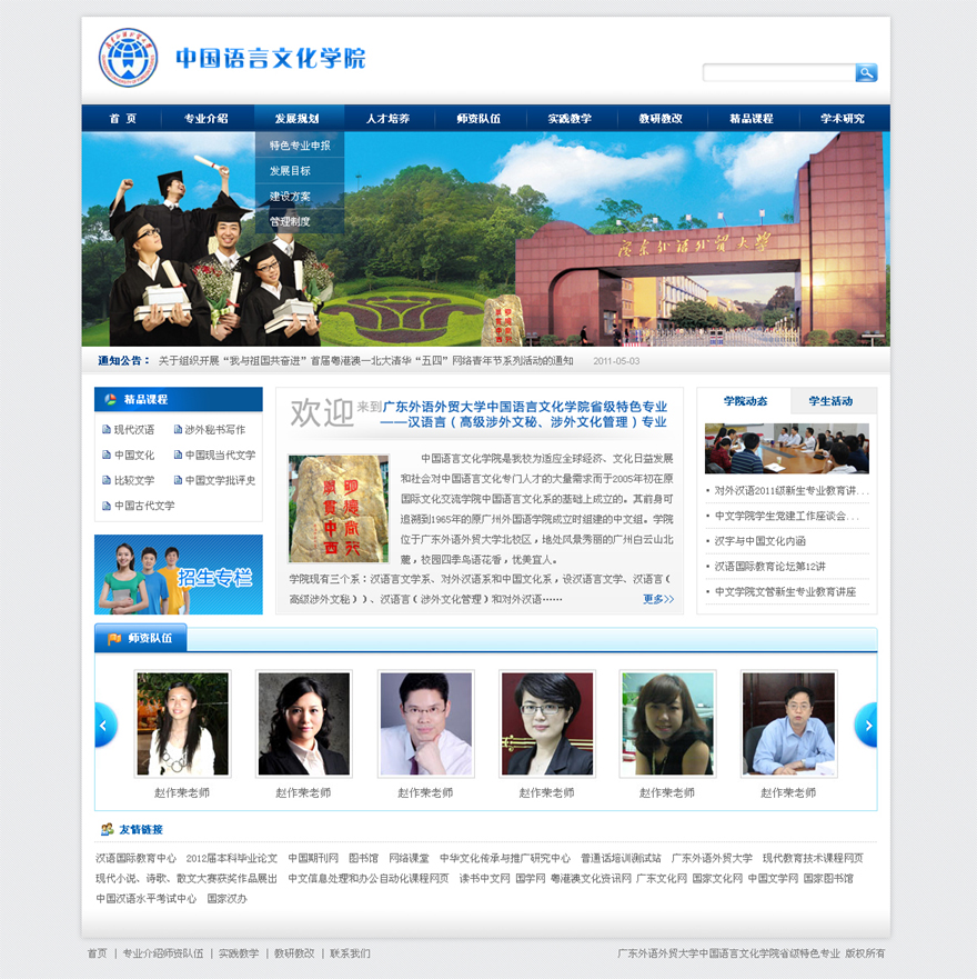 項(xiàng)目名稱:廣東外語(yǔ)外貿(mào)大學(xué)中文學(xué)院漢語(yǔ)言專業(yè)網(wǎng)站建設(shè)簽定日期:2011年10月8日網(wǎng)站網(wǎng)址:http://www.gwzwhyy.com/廣東外語(yǔ)外貿(mào)大學(xué)中文學(xué)院漢語(yǔ)言本科專業(yè)的前身是1986年開(kāi)設(shè)的中英文秘書(shū)專業(yè),1989年升本,1999年改為漢語(yǔ)言專業(yè),專...