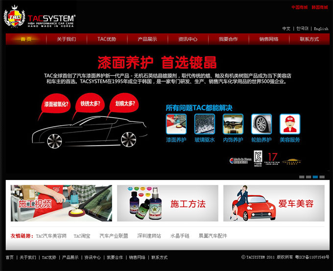 TACSYSTEM 1995年成立于韓國(guó)SOONCHUN,是一家專門研發(fā)、生產(chǎn)、銷售汽車美容用品的綜合性企業(yè)。主要生產(chǎn)和經(jīng)營(yíng)汽車漆面養(yǎng)護(hù)和汽車全系列美容產(chǎn)品,是全球第一家生產(chǎn)漆面無(wú)機(jī)結(jié)晶鍍膜的廠家。