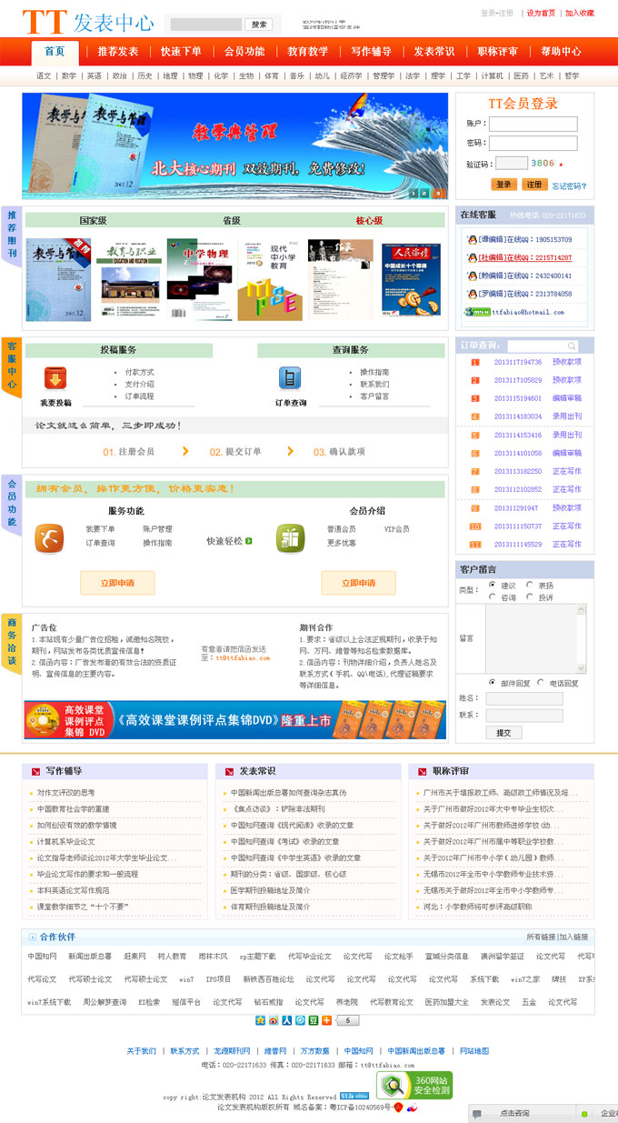 TT發(fā)表中心擁有8年專業(yè)為各類院校從事代理教育論文發(fā)表、教學論文發(fā)表的論文發(fā)表機構,以及提供相關專業(yè)咨詢服務。目前我們中心升級的TT發(fā)表中心是國內唯一實現(xiàn)訂單管理系統(tǒng)的代理發(fā)表類網(wǎng)站。該系統(tǒng)操作簡單、方便、快捷,用戶可以在幾分鐘內完成服務訂單所有操作,并可以在網(wǎng)上查詢服務訂單的進度。