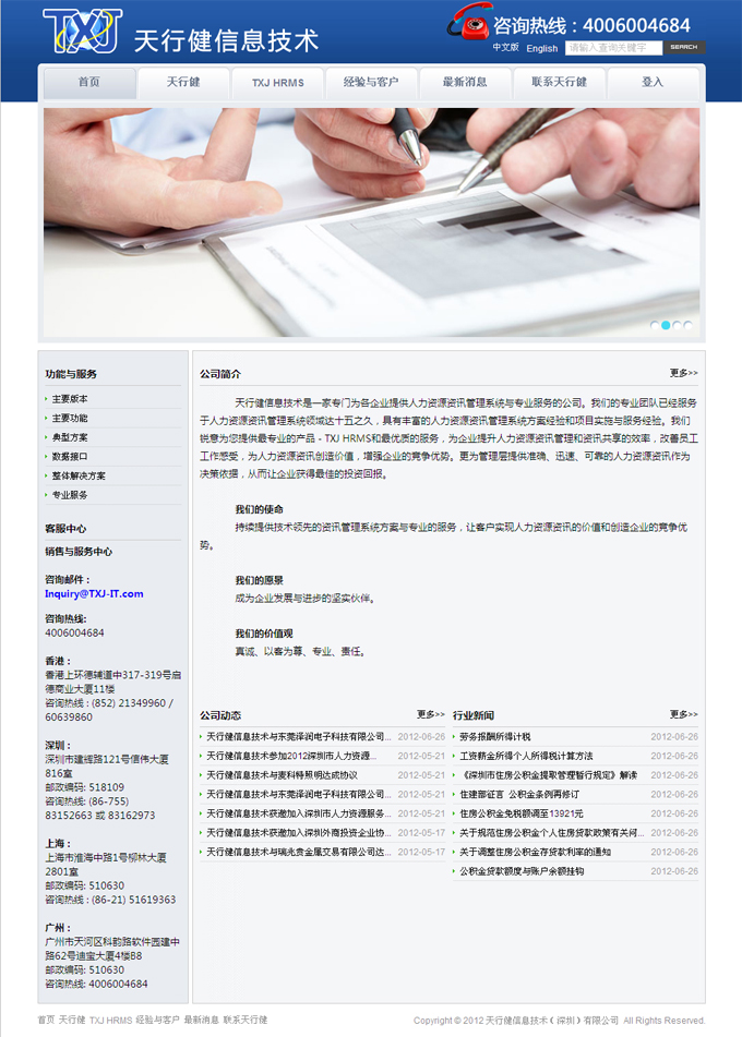天行健信息技術是一家專門為各企業(yè)提供人力資源資訊管理系統(tǒng)與專業(yè)服務的公司。我們的專業(yè)團隊已經服務于人力資源資訊管理系統(tǒng)領域達十五之久,具有豐富的人力資源資訊管理系統(tǒng)方案經驗和項目實施與服務經驗。我們銳a為您提供最專業(yè)的產品-TXJ HRMS和最優(yōu)質的服務,為企業(yè)提升人力資源資訊管理和資訊共享的效率,改善員工工作感受,為人力資源資訊創(chuàng)造價值,增強企業(yè)的競爭優(yōu)勢。更為管理層提供準確、迅速、可靠的人力資源資訊作為決策依據(jù),從而讓企業(yè)獲得最佳的投資回報。