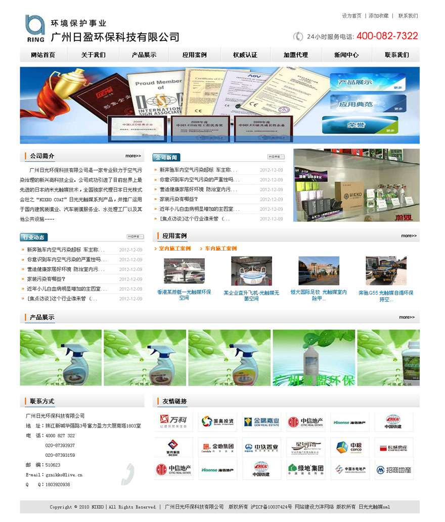 廣州日盈環(huán)??萍加邢薰臼且患覍I(yè)致力于空氣污染治理的新興高科技企業(yè)。公司成功引進(jìn)了目前世界上最先進(jìn)的日本納米光觸媒技術(shù),全國獨(dú)家代理日本日光株式會社之“NIKKO COAT”日光光觸媒系列產(chǎn)品,并推廣運(yùn)用于國內(nèi)建筑裝潢業(yè)、汽車裝-服務(wù)業(yè)、水處理工廠以及其他公共設(shè)施,該系列產(chǎn)品具備持續(xù)、安全、全面、有效的特性從根本上填補(bǔ)了國內(nèi)室內(nèi)環(huán)境全面治理技術(shù)的空白,并先后通過了國家各專業(yè)機(jī)構(gòu)的檢測和認(rèn)證,其各項(xiàng)空氣污染治理指標(biāo)均遠(yuǎn)遠(yuǎn)領(lǐng)先于國內(nèi)同類產(chǎn)品。