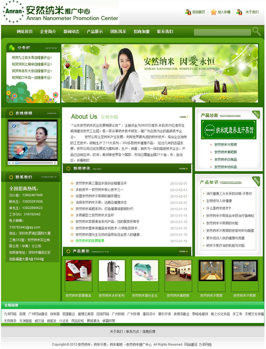 ? ? 公司立足納米產(chǎn)業(yè)發(fā)展,利用世界最先進的納米技術(shù),結(jié)合企業(yè)獨特的工藝技術(shù),研制生產(chǎn)了11大系列、300多款納米健康產(chǎn)品, 經(jīng)過幾年的迅猛發(fā)展,安然公司已經(jīng)發(fā)展成為集科研、生產(chǎn)、銷售、服務(wù)為一體的高新技術(shù)企業(yè),產(chǎn)品已遠銷亞洲、歐洲、美洲等世界各個國家,市場已覆蓋全國31個省、市、自治區(qū),并輻射歐洲市場,目前,已在國內(nèi)建立了六個分公司,并在國際上建立了多家分公司。