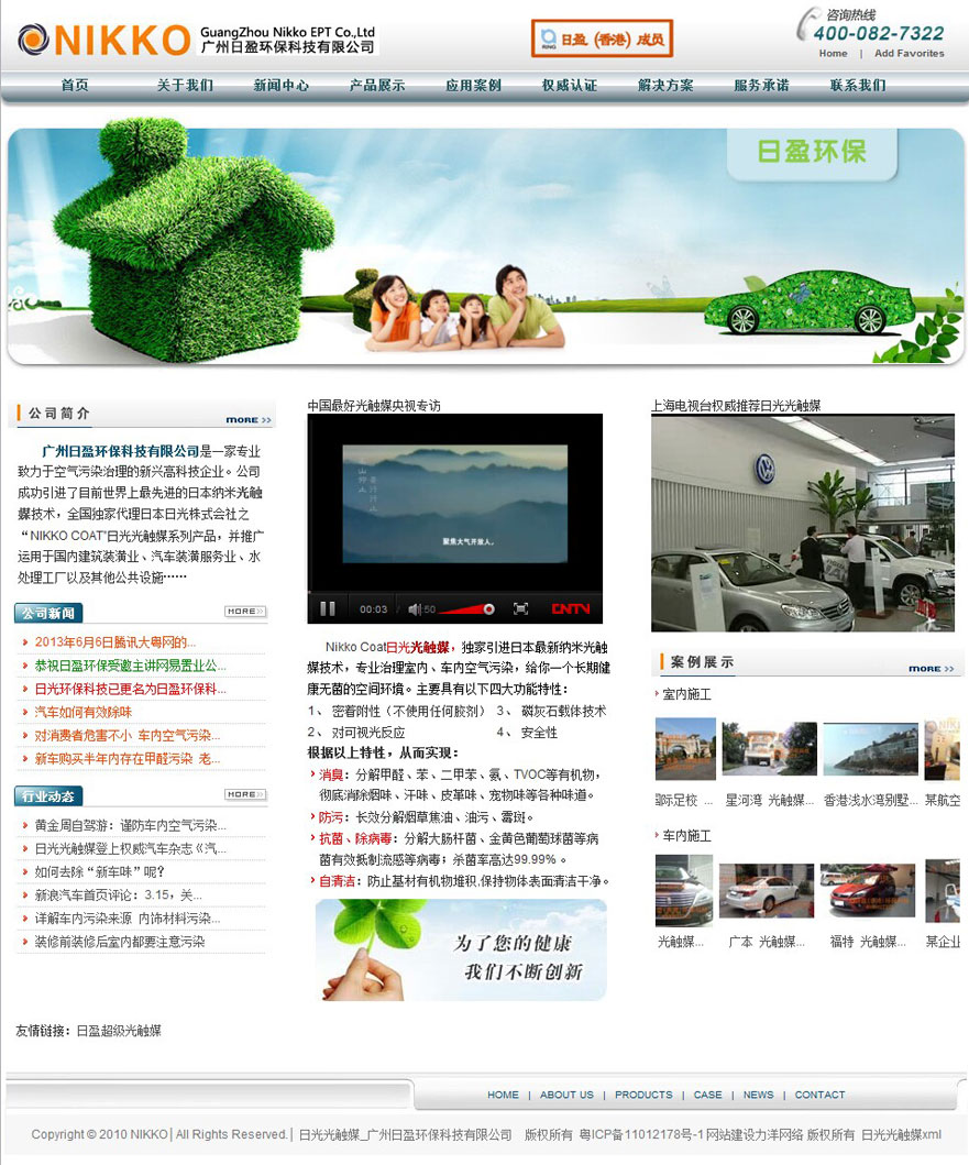 ? ? 廣州日盈環(huán)保科技有限公司是一家專業(yè)致力于空氣污染治理的新興高科技企業(yè)。公司成功引進(jìn)了目前世界上最先進(jìn)的日本納米光觸媒技術(shù),全國獨(dú)家代理日本日光株式會社之“NIKKO COAT”日光光觸媒系列產(chǎn)品,并推廣運(yùn)用于國內(nèi)建筑裝潢業(yè)、汽車裝潢服務(wù)業(yè)、水處理工廠以及其他公共設(shè)施,該系列產(chǎn)品具備持續(xù)、安全、全面、有效的特性從根本上填補(bǔ)了國內(nèi)室內(nèi)環(huán)境全面治理技術(shù)的空白,并先后通過了國家各專業(yè)機(jī)構(gòu)的檢測和認(rèn)證,其各項(xiàng)空氣污染治理指標(biāo)均遠(yuǎn)遠(yuǎn)領(lǐng)先于國內(nèi)同類產(chǎn)品。