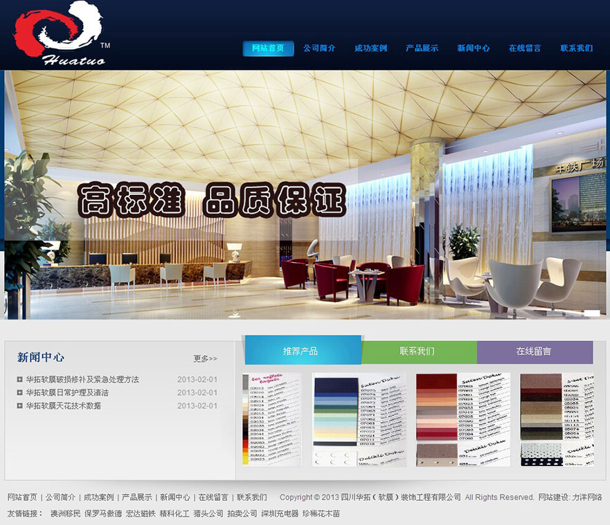 四川華拓(軟膜)裝飾工程有限公司,成立于2012年,至今公司致力于華拓軟膜天花產(chǎn)品的研發(fā)、銷售及安裝服務(wù)。公司的主;產(chǎn)品包括透光膜、光面膜、鏡面膜、規(guī)格板、緞面膜、金屬面膜和印花膜等100多種產(chǎn)品,華拓軟膜天花在全國市場的占有率均穩(wěn)居同行業(yè)前列,擁有數(shù)千名成功客戶案例,并已成功完成北京奧運場館——羽毛球館、運動員登記中心等軟膜工程項目!