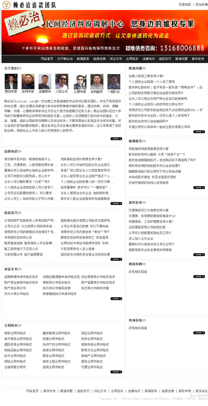 ??? 成員概況:賴(lài)必治是由數(shù)十名法律工作者組建的一支非訴訟服務(wù)團(tuán)隊(duì),其中有法院退休人員、司法機(jī)關(guān)退休人員,部隊(duì)退伍工作人員和在律師事務(wù)所選撥的經(jīng)濟(jì)糾紛律師對(duì)口人員。