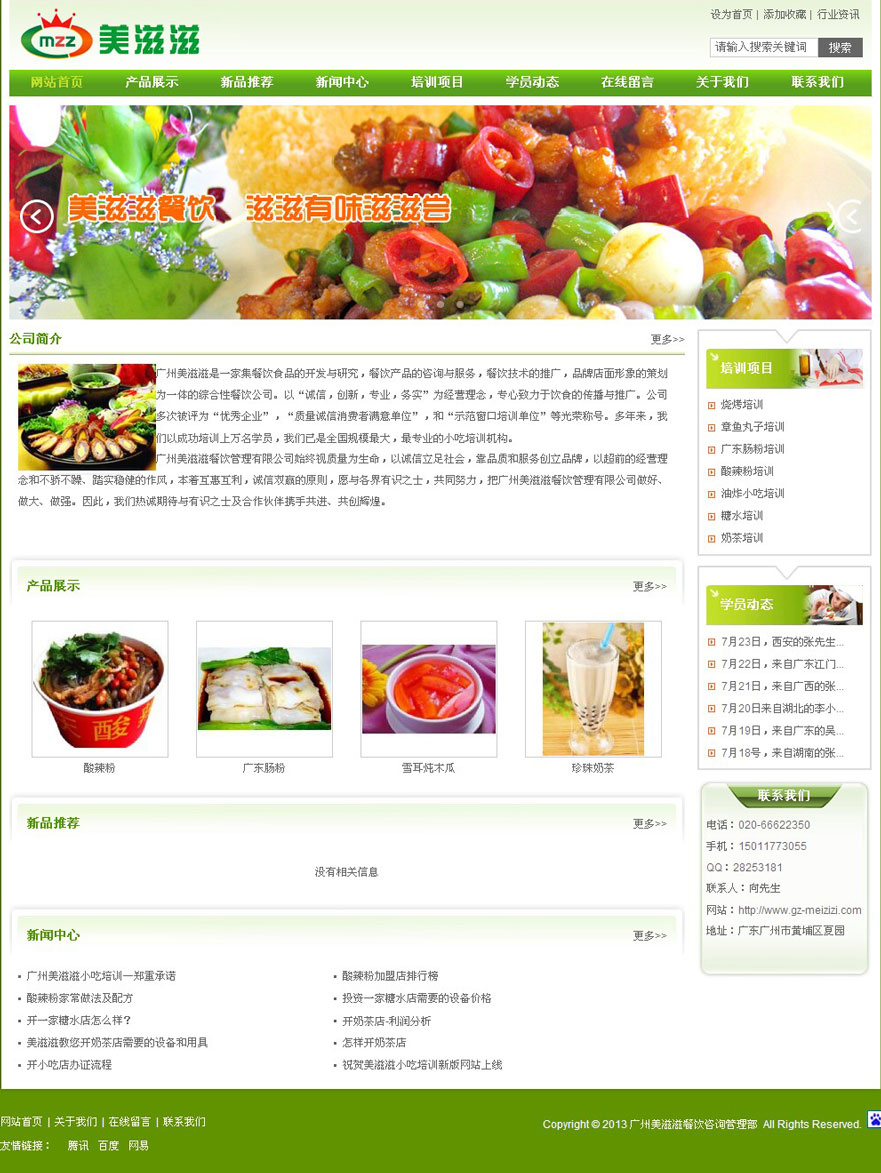??? 廣州美滋滋是一家集餐飲食品的開(kāi)發(fā)與研究,餐飲產(chǎn)品的咨詢(xún)與服務(wù),餐飲技術(shù)的推廣,品牌店面形象的策劃為一體的綜合性餐飲公司。以“誠(chéng)信,創(chuàng)新,專(zhuān)業(yè),務(wù)實(shí)”為經(jīng)營(yíng)理念,專(zhuān)心致力于飲食的傳播與推廣。公司多次被評(píng)為“優(yōu)秀企業(yè)”,“質(zhì)量誠(chéng)信消費(fèi)者滿(mǎn)意單位”,和“示范窗口培訓(xùn)單位”等光榮稱(chēng)號(hào)。多年來(lái),我們以成功培訓(xùn)上萬(wàn)名學(xué)員,我們已是全國(guó)規(guī)模最大,最專(zhuān)業(yè)的小吃培訓(xùn)機(jī)構(gòu)。