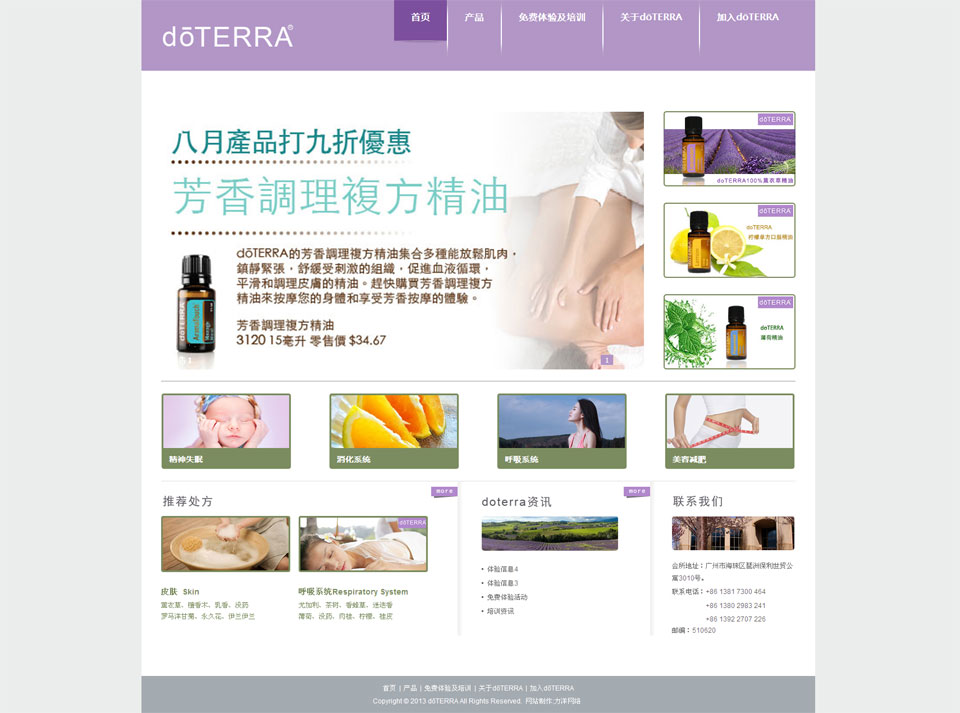 項目名稱:dōTERRA美商多特瑞網站建設 簽定日期:2013-8-14 項目網址:www.doterra-china.com 會所地址:廣州市海珠區(qū)琶洲保利世貿公寓3010號。 聯(lián)系電話:+86 1381 7300 464 +86 1380 2983 241 +86 1392 2707 226 網站首頁設計稿縮略圖: