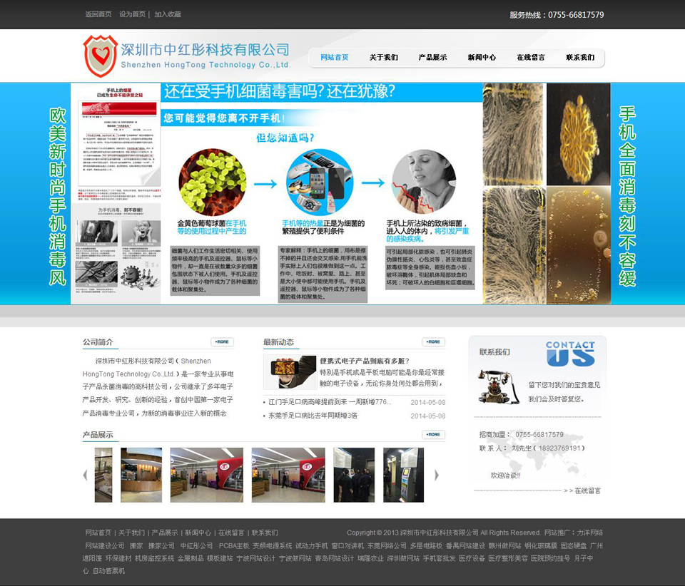 深圳市中紅彤科技有限公司(ShenzhenHongTongTechnologyCo.,Ltd.)是中國第一家專業(yè)從事便攜式電子產(chǎn)品殺菌消毒的高科技公司,公司繼承了多年電子產(chǎn)品和設(shè)備開發(fā)、研究、創(chuàng)新的經(jīng)驗,首創(chuàng)中國第一家便攜式電子產(chǎn)品殺菌消毒專業(yè)公司,并擁有相關(guān)多項專利,為新的消毒殺菌事業(yè)注入新的概念,成為這一新興行業(yè)的領(lǐng)航人。