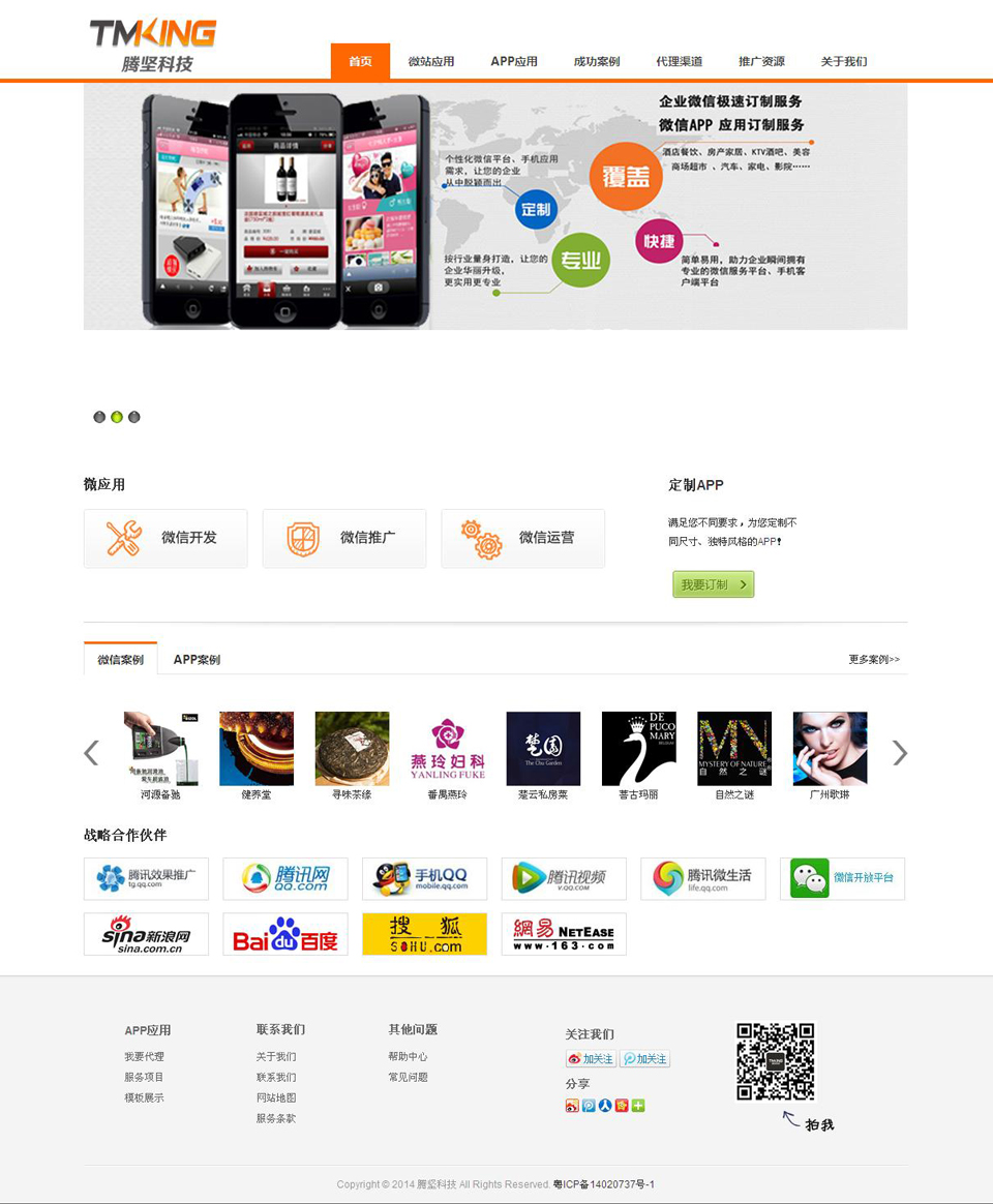 廣州騰堅(jiān)信息科技有限公司,是一家專業(yè)從事于移動(dòng)互聯(lián)網(wǎng)產(chǎn)品開發(fā)的高新科技企業(yè),旨在幫助企業(yè)、個(gè)人能簡(jiǎn)單、快速、廉價(jià)、高效地建設(shè)自己滿意的移動(dòng)營銷平臺(tái),輕松涉足移動(dòng)互聯(lián)網(wǎng),把握未來。是國內(nèi)領(lǐng)先的在線應(yīng)用開發(fā)平臺(tái),提供自建、定制、發(fā)布、管理一站式服務(wù)。通過SaaS模式(軟件即服務(wù)的模式)向用戶提供服務(wù),大大降低了應(yīng)用的開發(fā)、維護(hù)成本,同時(shí)通過一次開發(fā)全平臺(tái)(IOS/Android/手機(jī)網(wǎng)站)適配的創(chuàng)新技術(shù),大大提升了開發(fā)效率。本公司管理層曾任職于各大互聯(lián)網(wǎng)公司:騰訊、百度、新浪等有著廣泛的合作。