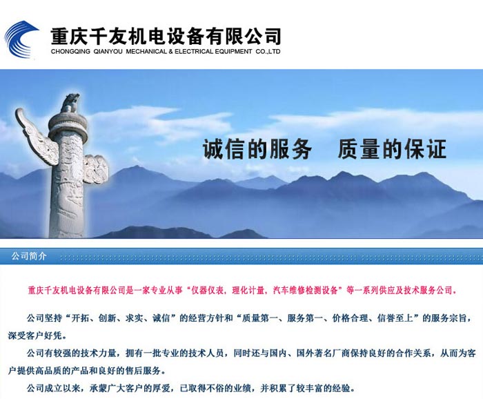 項(xiàng)目名稱:重慶千友機(jī)電設(shè)備有限公司 簽定時(shí)間:2014-2-25 項(xiàng)目網(wǎng)址:http://www.cqqyjd.com 項(xiàng)目簡介: