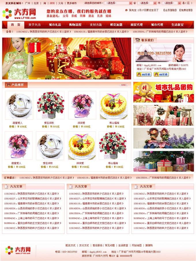 ??? 《六方網(wǎng)》是一家以本地服務(wù)、本地配送為親友送禮的大型網(wǎng)上商城,以城市鮮花蛋糕配送、城市生活用品速遞、城市名品特賣及六方精品專賣為主要經(jīng)營業(yè)務(wù)。涵蓋一般禮節(jié)性的交往送禮和親人間的實質(zhì)生活關(guān)懷,為您的親友提供包括鮮花、蛋糕、保健品、名煙、名酒、茶葉、及各地特產(chǎn)等在內(nèi)的各類精美商品。《六方網(wǎng)》在您親友的所在地都建有服務(wù)中心服務(wù)中心組織當?shù)貎?yōu)秀生活用品供貨商、配送商為您的親友提供優(yōu)質(zhì)高效的本地化配送服務(wù)。您的親友在哪,我們的服務(wù)就在哪。?每個人的世界都是由六度親情向外延伸。