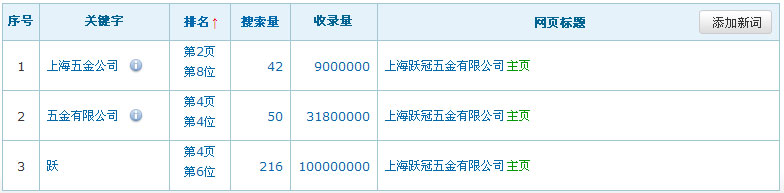 關(guān)鍵詞在百度排名數(shù)據(jù):(暫時(shí)只列出百度的排名數(shù)據(jù),其它搜索引擎的排名效果暫不列出)