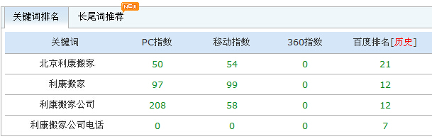 網(wǎng)站名稱:北京利康搬家公司 網(wǎng)址:http://www.likangchina.cn 關(guān)鍵詞:利康搬家,利康搬家公司 服務(wù)類型:收費(fèi)(8000元/年) 關(guān)鍵詞在百度排名數(shù)據(jù):(暫時(shí)只列出百度的排名數(shù)據(jù),其它搜索引擎的排名效果暫不列出)